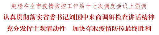趙璟指出,在我市疫情防控掃尾階段,省委書記劉國中再次來商調研檢查,充分肯定我市近期工作成效,對我們一鼓作氣打贏疫情防控殲滅戰提出要求,充分體現了省委對商洛工作的高度重視和對全市干部群眾的深切關懷。全市上下要堅持“外防輸入、內防反彈”總策略和“動態清零”總方針,認真貫徹落實劉國中同志講話精神,增強“時時放心不下”的責任感,充分發揮主觀能動性,始終保持良好狀態,加壓加速、奮力沖刺,堅決奪取疫情防控最終勝利,為黨的二十大勝利召開營造安全穩定的社會環境。