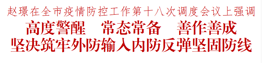 趙璟在聽取匯報后指出,當前國內疫情嚴峻復雜,周邊地區疫情多點散發,我市“外防輸入、內防反彈”壓力持續加大。全市上下要始終保持清醒警醒,科學研判形勢,加快實現本輪疫情掃尾清零,持續筑牢常態化疫情防線,堅決守住不發生規模性疫情反彈的底線。