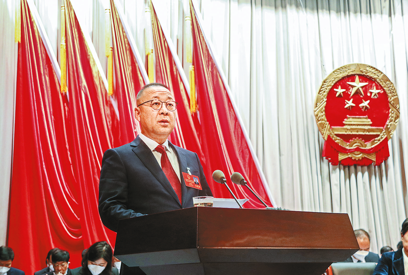 市長王青峰代表市政府向大會作政府工作報告。(本報記者 李小龍 攝)