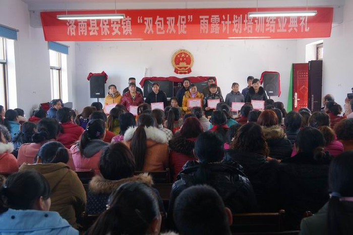 保安鎮為期1月的“雙包雙促”雨露計劃培訓圓滿結束。11月26日在鎮機關四樓會議室舉行“雙包雙促”雨露計劃培訓結業典禮儀式。商洛新潮學院院長、縣扶貧局及鎮相關領導出席結業典禮儀式。結業典禮上商洛新潮學院的院長對本次培訓做了總結,優秀學員代表做了表態發言并為參加培訓的學員頒發了結業證書。