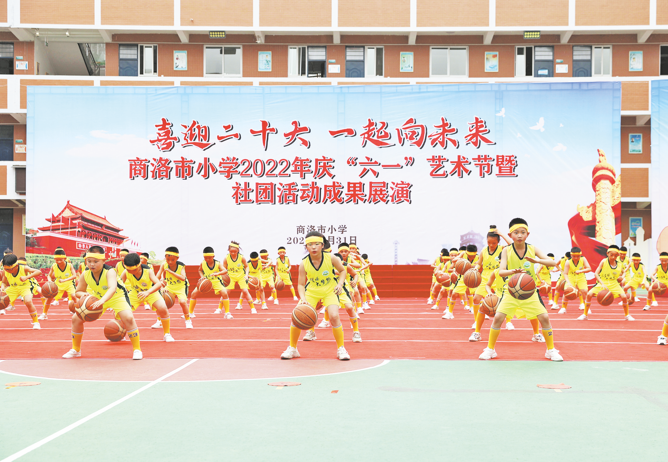 ①5月31日,商洛市小學舉辦慶“六一”藝術節暨社團成果展演活動,各個社團的學生通過舞蹈、誦讀、樂器合奏、羽毛球和籃球操等,展現少年兒童蓬勃向上的精神風貌。據了解,今年以來,該校切實落實“雙減”政策,積極為學生搭建展示才華的平臺,不斷激發學生創新意識和創造能力,全面提升學生的核心素養。
