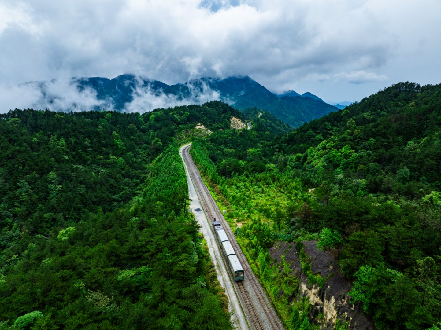 乘坐纜車登頂明月山后,艾芙琳漫步青云棧道,俯瞰月亮湖的碧波,并體驗了高山小火車“嫦娥號”,沿途的云海、森林與村落交織,宛如畫卷。 明月山小火車穿行在山野間。陳旅 攝