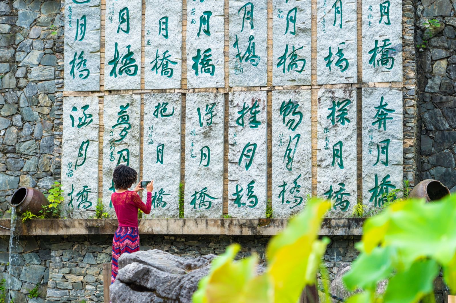 隨后,艾芙琳探訪了入選“國家森林養生重點建設基地”的二十四橋明月園。這座占地3150畝的綜合性莊園以月亮文化和橋文化為主題,融合農業觀光、森林康養、民俗體驗于一體。園內自產自足的綠色食材、百畝花海、24座特色小橋,以及書法家創作的“明月”主題作品,令艾芙琳連連稱贊:“這里實現了人與自然的完美共生。” 艾芙琳正在拍攝石刻書法作品 陳旅 攝