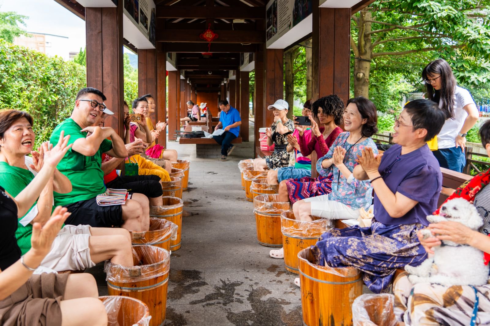 站在溫湯古井旁,艾芙琳與來自上海、廣州等地的“新溫湯人”親切交流。這群長期旅居的退休老人,每日在文化長廊泡腳、唱歌,享受富硒溫泉帶來的健康生活。來自上海的退休教師王美華已在溫湯鎮旅居3年。她說:“我患有輕度關節炎,來這里泡溫泉半年后,疼痛明顯緩解。現在每天和朋友們在長廊泡腳唱歌,生活愜意。” 艾芙琳與“新溫湯人”在一起唱歌。陳旅 攝