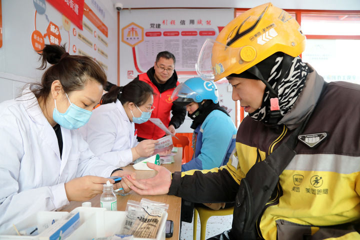 2025年3月5日,志愿者在山東省棗莊市市中區一工會驛站為外賣員免費測量血糖。新華社發(王海楠攝)
