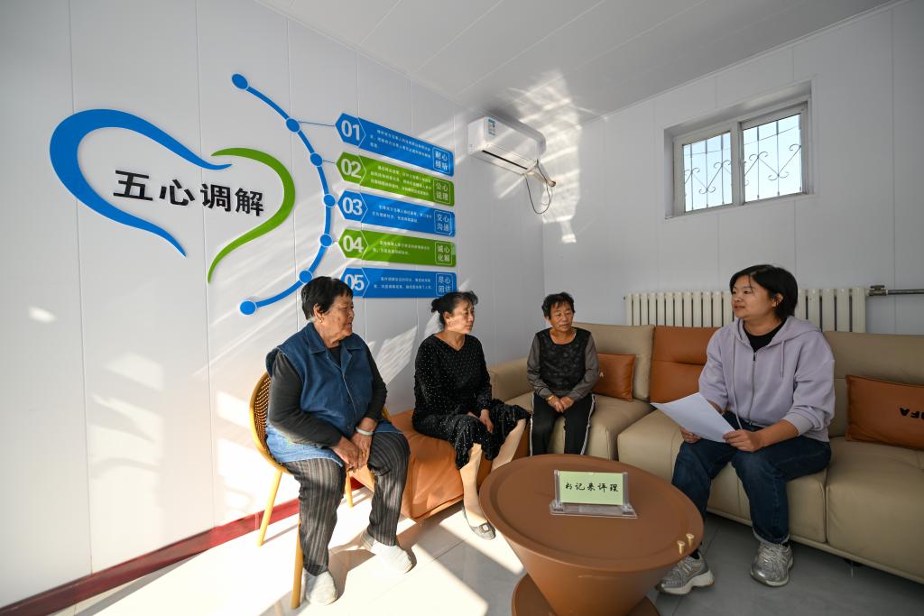 在天津市寧河區(qū)蘆臺街道金華路社區(qū),社區(qū)黨總支副書記吳蕊(右一)就社區(qū)監(jiān)控設備安裝問題為社區(qū)居民進行解答(2024年10月11日攝)。金華路社區(qū)積極踐行新時代“楓橋經驗”,將原社區(qū)居委會閑置用地提升改造成為聯(lián)絡群眾的基層綜合治理陣地——“解鈴小院”。 新華社記者 孫凡越 攝