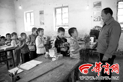 王杰是商洛市商州區麻街鎮五星村窯坡初小四年級班長。他說:“我們這里沒有商店,買賀卡要到山下走10里路,沒時間去,我就和同學王明晨商量采野花,采回來后再分給每個同學,分別送給李老師,并說上一句祝福的話,不許學樣重復說。”