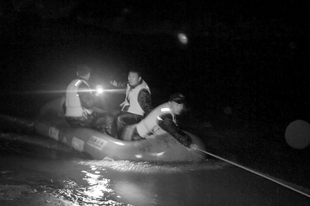7時(shí)12分,各種救援物品運(yùn)到現(xiàn)場(chǎng),龍駒寨鎮(zhèn)的干部和丹鳳縣120急救人員也相繼趕到了現(xiàn)場(chǎng)增援。在劉丹鋒副局長(zhǎng)的指揮下,300米長(zhǎng)的繩索將橡皮筏兩頭牢牢拴住,數(shù)十條燈柱照在寬闊的河面上,鋪開一條光路,巡警隊(duì)李聃、舒浩哲和姚浩男三名民警主動(dòng)請(qǐng)纓,登上橡皮筏,撐著竹竿向河對(duì)岸劃去。然而,橡皮筏到河中間后,多次遭遇急流失去方向,岸邊的人們一次又一次用繩索將被沖向下游的橡皮筏拽回。半小時(shí)過去了,橡皮筏還是過不了河,雨水已將所有人的衣服淋得濕透,民警們毫不氣餒,不斷地尋找新的路線。最后,他們冒險(xiǎn)直接從上游急流處入水,隨急流下漂的3名民警奮力撐劃,終于成功抵岸,當(dāng)晚8時(shí)05分,被困的周名連老人被安全救回。