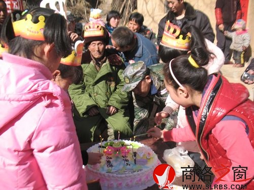 10時(shí)許,100多人為老人祝壽的隊(duì)伍來(lái)到楊德全的門前,把老人和鄰居的門前站得滿滿的。活動(dòng)負(fù)責(zé)人風(fēng)無(wú)語(yǔ)宣布祝壽活動(dòng)開(kāi)始后,為老人打掃房間的、貼對(duì)聯(lián)的、安自帶音響的、洗菜的、和面的、包餃子的,一切都有條不紊地進(jìn)行著。隨著一陣鞭炮響起,楊德全被安排在壽星席上,他的面前放著志愿者在商州城里訂做的最大一款的蛋糕,幾名志愿者帶來(lái)的孩子為老人點(diǎn)生日蠟燭,為他佩戴軍功章。能歌善舞的志愿者,就唱起了歌、跳起了舞。
