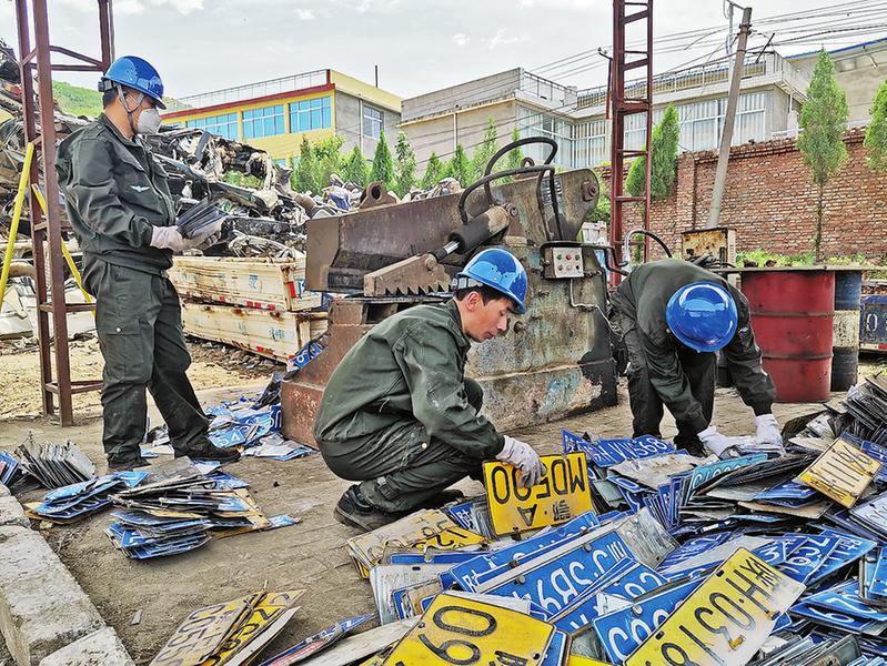 5月26日,市交警支隊車管所在商洛市磊寶報廢汽車回收拆解有限責任公司開展機動車號牌集中銷毀活動,對2019年辦理轉移登記號牌、殘損號牌、辦理注銷業務回收的廢舊號牌以及路面秩序查扣的假牌套牌等車牌進行逐塊切割、解體銷毀,共銷毀廢舊號牌1.2萬面。(宋雨萌攝)