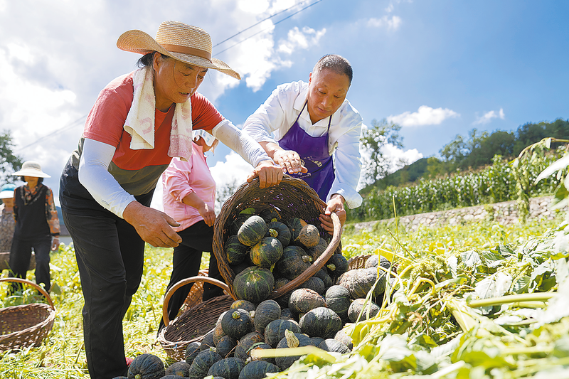 累累的果實掛滿枝頭,翠的核桃、黃的桃子、紫的葡萄、墨綠的南瓜,還有成片的玉米和大豆,烤煙的葉片大得像蒲扇,大片大片如綠色的幕布鋪滿大地,豐收成為這一時節的主旋律。