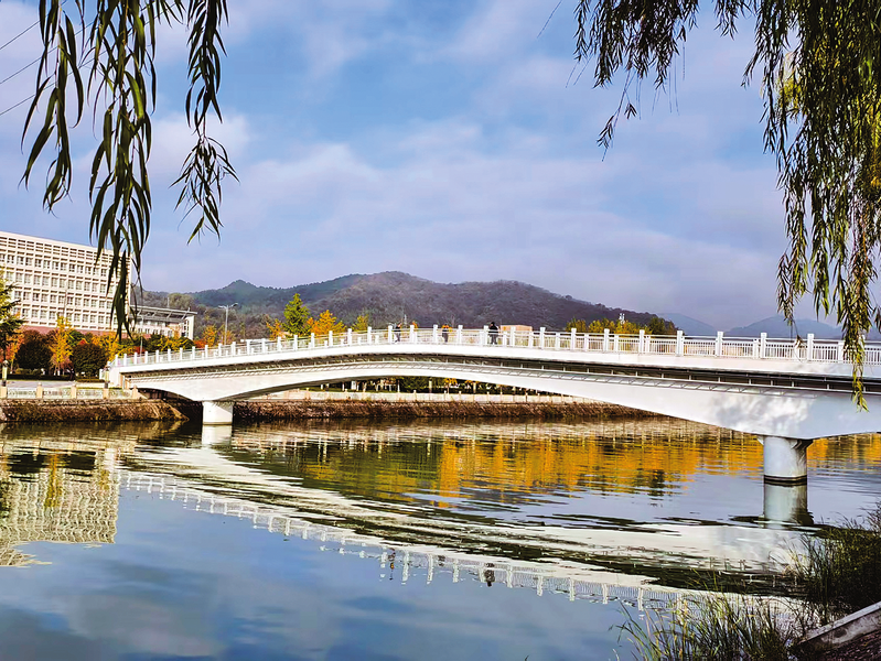 △在市區丹江公園,碧藍而高遠的天空、白色的橋和金色的銀杏葉倒映在清澈的河水中,如同一幅秋日油畫。 ?市區濱江銀杏公園內,市民在高大的銀杏樹間散步,盡顯秋日的愜意。