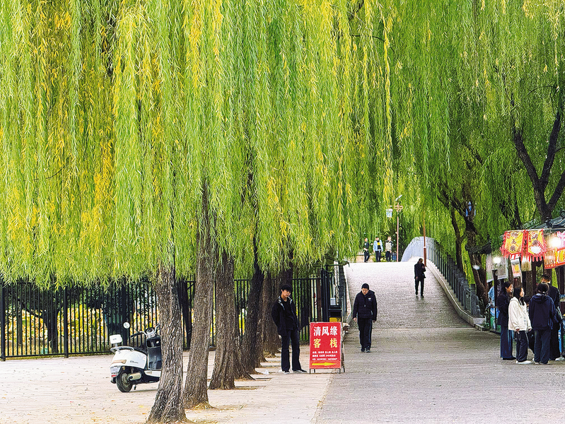 在丹鳳縣棣花古鎮,柳枝翠綠中夾雜著金黃,如美女柔順的發絲千萬條垂下,別具一種秋日的美。