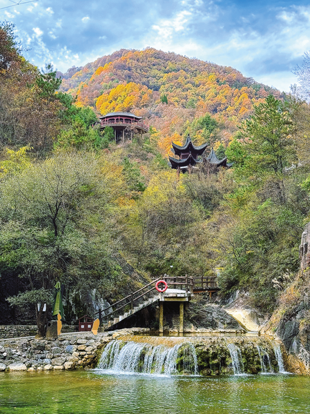 ?在秦嶺江山景區,飛檐翹角的亭子掩映在碧水、藍天和斑斕的山色中,共同構成了一幅秋日盛景。