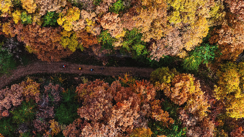 △俯瞰老林溝,樹(shù)上各色葉子交織在一起,如同一幅五彩斑斕的畫(huà)。
