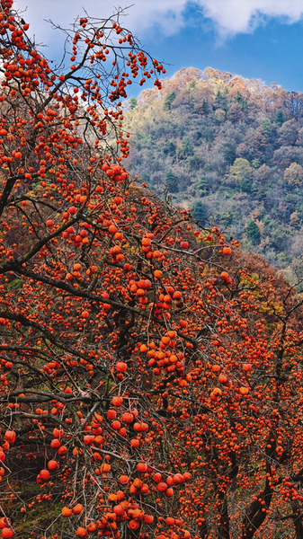 商州區(qū)楊斜鎮(zhèn)的柿子樹(shù)上,有商洛秋天最亮眼的一抹紅。枝頭掛滿了橙紅的柿子,像一盞盞小燈籠,在藍(lán)天白云的映襯下,與遠(yuǎn)處的山巒構(gòu)成一幅絕美的田園風(fēng)光畫(huà)。