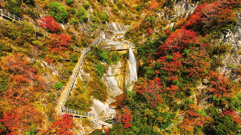 走進(jìn)山陽(yáng)縣天蓬山寨,紅葉似燃燒的火焰,爛漫如云霞,將景區(qū)裝點(diǎn)得如夢(mèng)如幻。