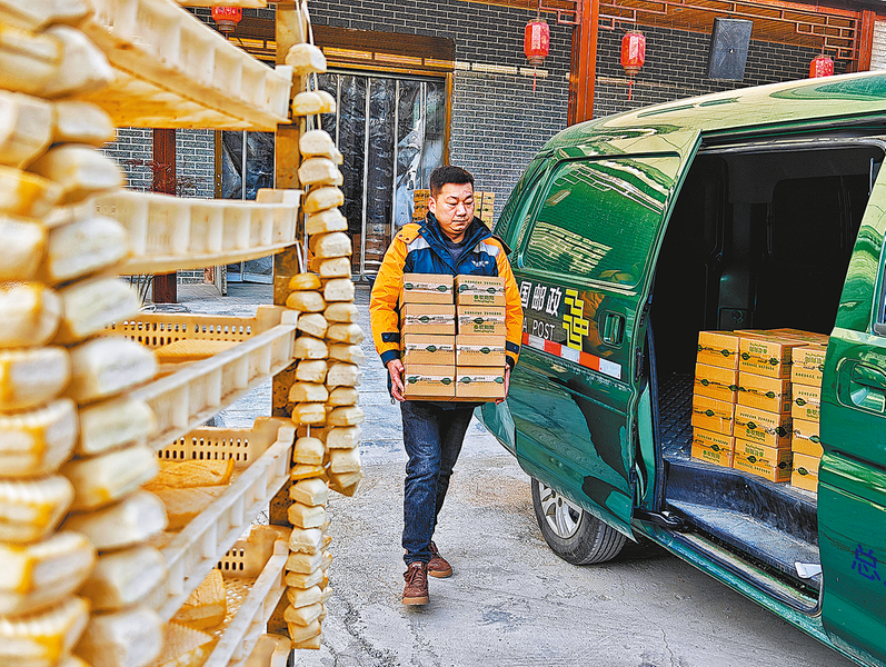 △在電商活動中,商洛郵政幫助洛南6家合作社銷售12款農(nóng)產(chǎn)品共計1.1萬單。圖為郵政工作人員上門攬收豆制品快件。