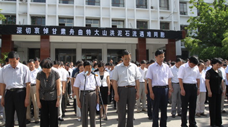 本網訊 今天(8月15日)上午10時,商洛市在市委、市政府院內向甘肅舟曲特大山洪泥石流遇難同胞深切哀悼。國旗下降一半,鳴笛。魏增軍、許恢佩、楊長亞、王甲訓、劉淑慧等市上領導參加了哀悼儀式。(樊立懷)