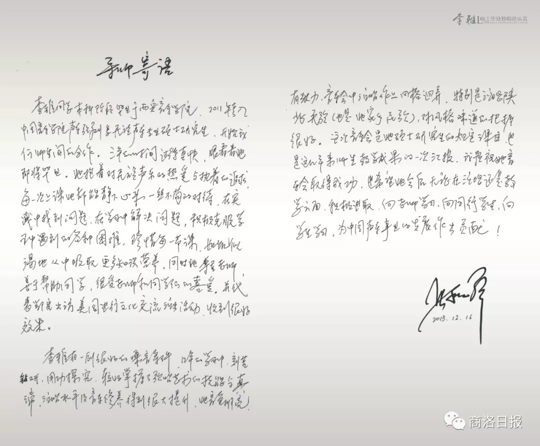 張志宏:你的學生韓香是這樣說的:“李雅老師讓我學會了在嘈雜的環(huán)境中讓自己找到心靈的寧靜。”她說:“這不僅是來自音樂,但更多的仍來自音樂以外。李雅老師人如其名,溫雅平和踏實細致。她不僅是民歌百靈鳥,還是我的女神,我的恩師,是我心中最閃亮的星,向她靠攏是我最大的努力目標。”