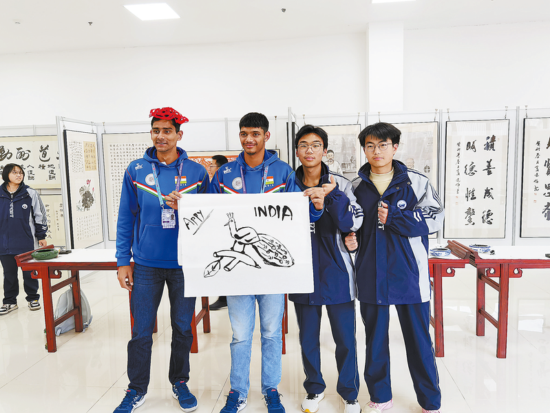 12月9日,印度隊員走進商洛中學,用毛筆畫下印度國鳥——藍孔雀,定格中外少年的暖心情誼。 (本報記者 景 康 攝)