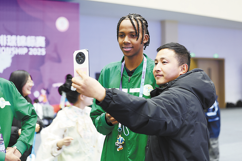 12月9日晚,“2025年U15世界中學生排球錦標賽國家之夜”活動在商洛市職業技術學院大學生活動中心舉行,運動員與球迷合影。 (本報記者 石 磊 攝)