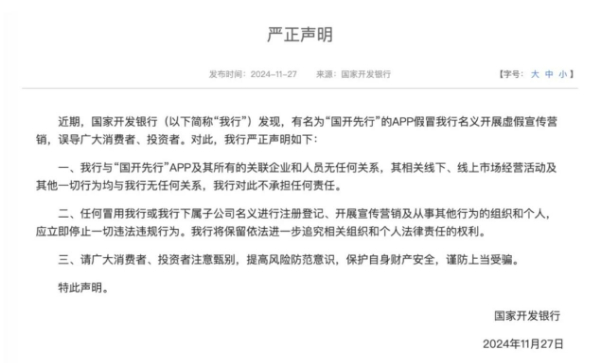 詳情:近期,有名為“國開先行”的APP假冒國家開發(fā)銀行名義開展虛假宣傳營銷,誤導(dǎo)廣大消費者、投資者。對此,國家開發(fā)銀行于11月27日在官網(wǎng)發(fā)布《嚴(yán)正聲明》: