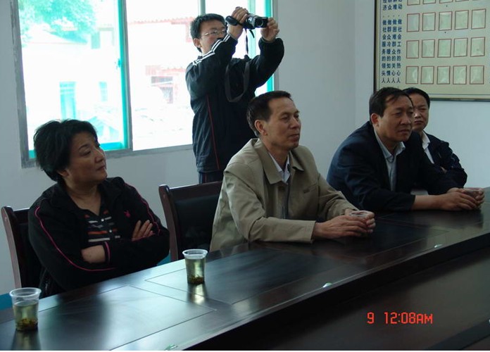 市環保局黨組書記、局長翁同德(左二)、黨組成員、副局長袁 娜(左一)、黨組成員、紀檢組長閆緒民聽取東川鎮黨委和鄭家莊村委會匯報全村經濟社會發展情況。