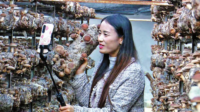 大棚里,工人們忙著采收成熟的香菇。地上到處擺放著一筐筐剛剛采摘來的新鮮香菇,4位網紅穿梭在一排排香菇架間,向粉絲展示香菇的生長環境,講解工人們采菇、選菇的過程。“丹鳳萌萌”手捧一個長滿“小傘”的香菇棒,不時轉動著手機向粉絲介紹香菇的生長狀態以及花菇同平菇的區別。直播間里互動頻繁,異常活躍。