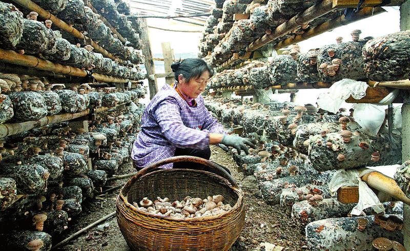 在桑樹村的香菇種植基地里,村民們正在忙著采摘、搬運香菇。在村民潘紅英家的香菇棚里,只見她麻利地把菌棒上一個個肥厚的香菇摘入籃中,不一會兒就摘了一籃子。