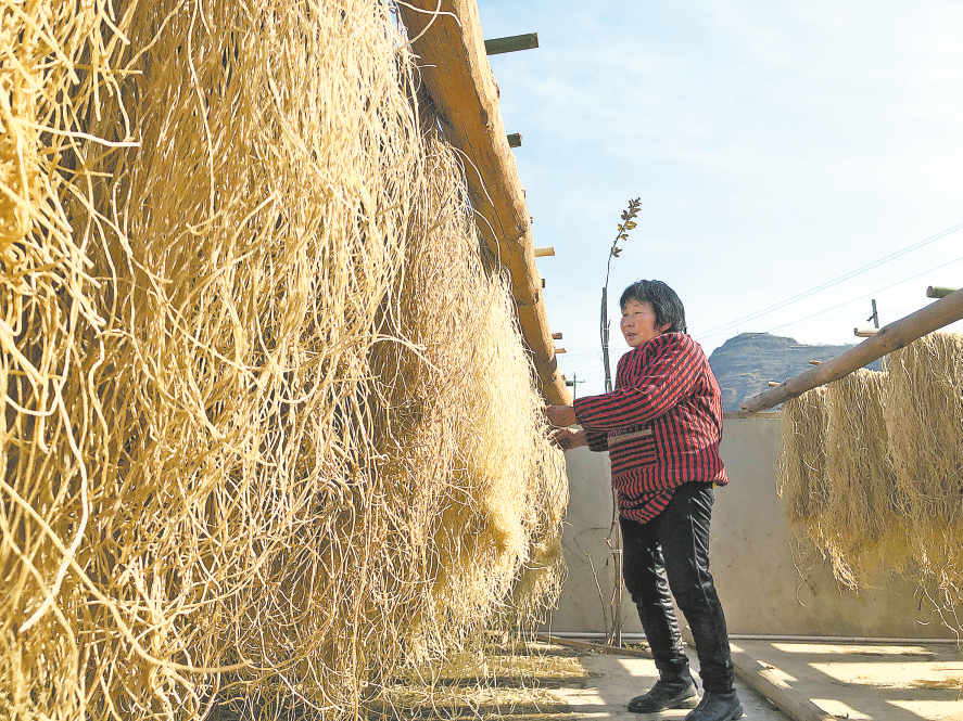 △萬灣社區(qū)充分調(diào)動黨員群眾發(fā)展產(chǎn)業(yè),人均年純收入突破2萬元。圖為萬灣村集體經(jīng)濟粉條加工廠內(nèi),群眾正在晾曬粉條。