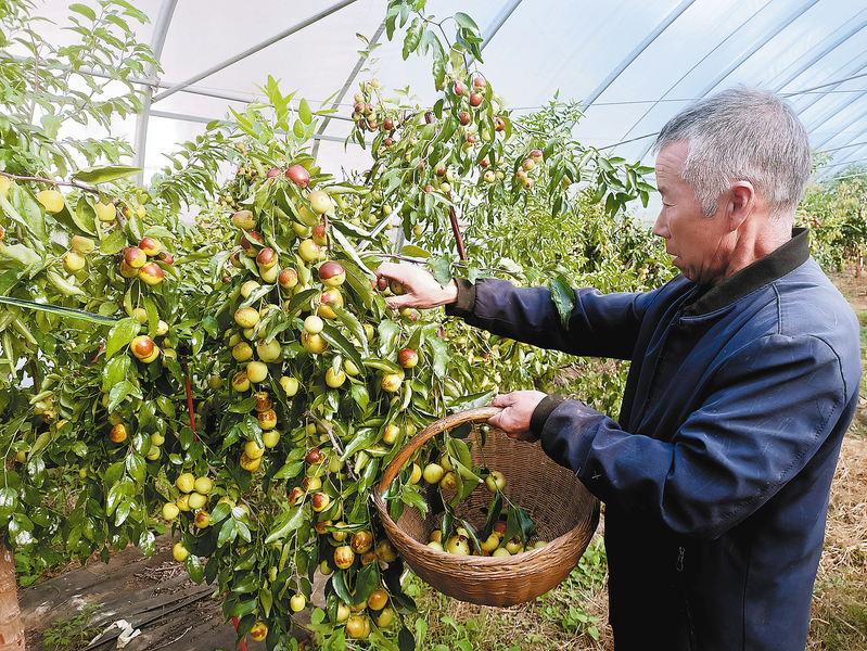 10月20日,丹鳳縣鐵峪鋪鎮化廟村群眾在采摘冬棗。據悉,該村從2021年發展大棚冬棗,目前有6座大棚冬棗已進入產果期,預計今年可采收優質冬棗3000多公斤,帶動村級集體經濟收入6萬元。 (本報通訊員 田 東 攝)