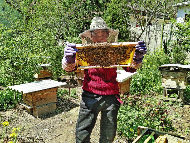 4月12日,洛南縣靈口鎮曹窯村十八坪組群眾王銀勞正在查看蜂巢。據了解,王銀勞是曹窯村建檔立卡貧困戶,2017年開始養殖中華蜂,從最初的4箱發展到目前的75箱,去年已實現穩定脫貧,預計今年養蜂可實現收入1.5萬元。(劉衛鋒 攝)