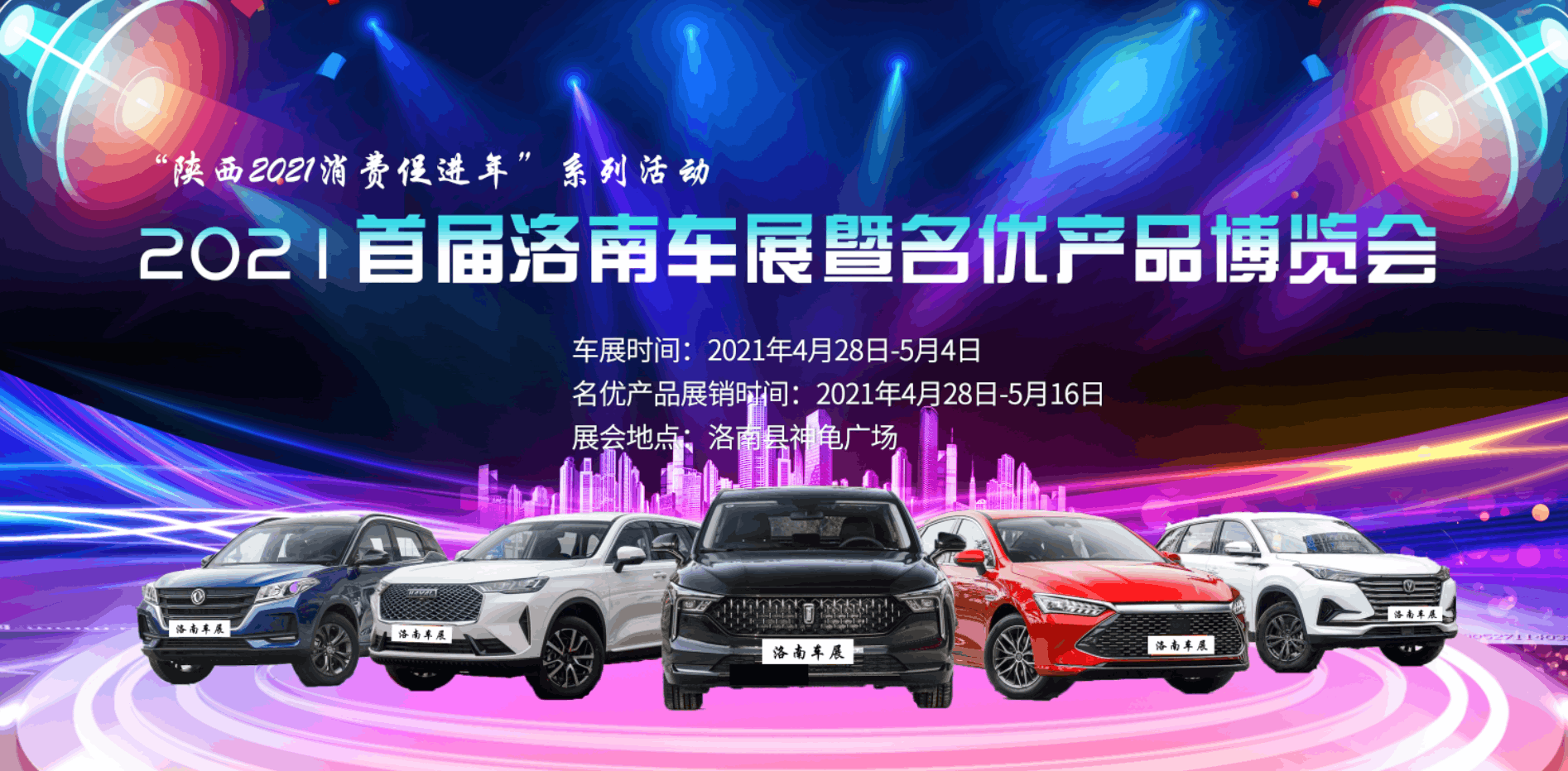 4月28日至5月4日、4月28日至5月16日,由陜西博納金域文化傳媒有限公司承辦的2021首屆洛南車展暨名優產品博覽會將在洛南縣神龜廣場舉行。