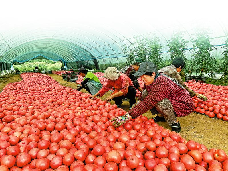 8月18日,筆者走進(jìn)洛南縣古城鎮(zhèn)中聯(lián)村集體經(jīng)濟(jì)蔬菜大棚,只見(jiàn)鮮紅欲滴的西紅柿掛滿(mǎn)了枝頭,在綠葉的映襯下顯得格外嬌艷奪目,大棚內(nèi)散發(fā)著誘人的果蔬香甜。進(jìn)棚務(wù)工的村民正在采摘西紅柿,等待裝箱的西紅柿像紅色的地毯一樣鋪滿(mǎn)地面,一派豐收喜人的景象。