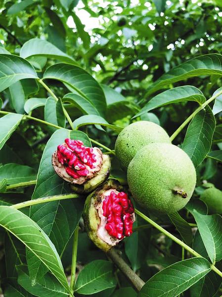 紅仁核桃原產地美國加州。洛南董兆斌下崗回鄉從事核桃殼收購、加工、銷售中,他意外發現紅仁核桃信息。因其生產的核桃殼粉產品出口美國,就委托出口企業輾轉多地連續兩年從美國進口紅仁核桃進行種植,均未出苗。后在有關部門的支持下,于2015年春以每株6000元的價格從美國引進紅仁核桃嫁接苗100株,在洛南四皓街辦謝灣租地栽植,成活97株,另3株砧木發芽。