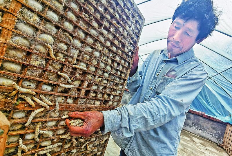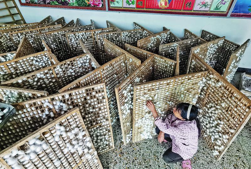 村民吳鳳霞在自家院子里縫補(bǔ)蠶盤,她一邊熟練地縫補(bǔ)一邊笑著說:“今年一茬養(yǎng)了80多盤蠶,能收160斤左右的蠶繭。我家養(yǎng)蠶有10多年了,不出門在家養(yǎng)蠶,對(duì)于我們留守在村里的人來說,受點(diǎn)苦在家就能掙錢,也算是一個(gè)好營生。”在吳鳳霞家的客廳,整齊地?cái)[滿了已經(jīng)完成結(jié)繭的蠶盤。手工打造的紅柜和墻上嶄新的年畫,映襯出這家人的紅火日子。
