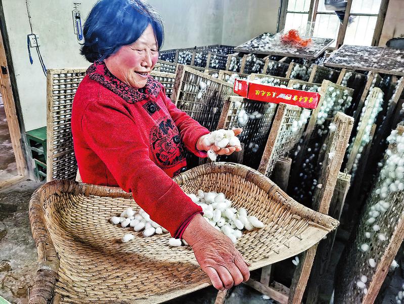 記者來到蠶桑養(yǎng)殖戶雷雪惠家,她正在整理已經(jīng)采收好的蠶繭。“我今年60多歲,養(yǎng)蠶20多個(gè)年頭了,是我們村第一批養(yǎng)蠶戶。通過養(yǎng)蠶,我們家養(yǎng)大了3個(gè)孩子,現(xiàn)在2個(gè)女兒都已經(jīng)嫁人,兒子常年在外。我們老兩口和留守在村子里的其他人一樣,靠著桑樹養(yǎng)蠶,一年收入近2萬元,夠我們生活,還有些結(jié)余。”雷雪惠笑著說。