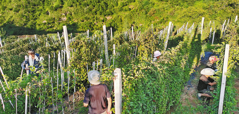 八月二十日,在洛南縣保安鎮黑潭村后坡塬上的洛南縣云瑞中藥材專業合作社一千三百多畝的五味子產業園里,工人正忙著采摘。近年來,黑潭村依托當地優勢資源稟賦,不斷探索林下養雞、圈舍養牛、生豬飼養、連翹栽植以及北五味子產業發展賦能鄉村振興的新路子,持續壯大村級集體經濟,拓寬群眾增收渠道。(本報通訊員 楊開讓 攝)