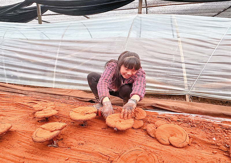 △食用菌產業園為周邊群眾提供務工崗位,讓群眾實現穩定增收。圖為工人何芬正在剪靈芝。