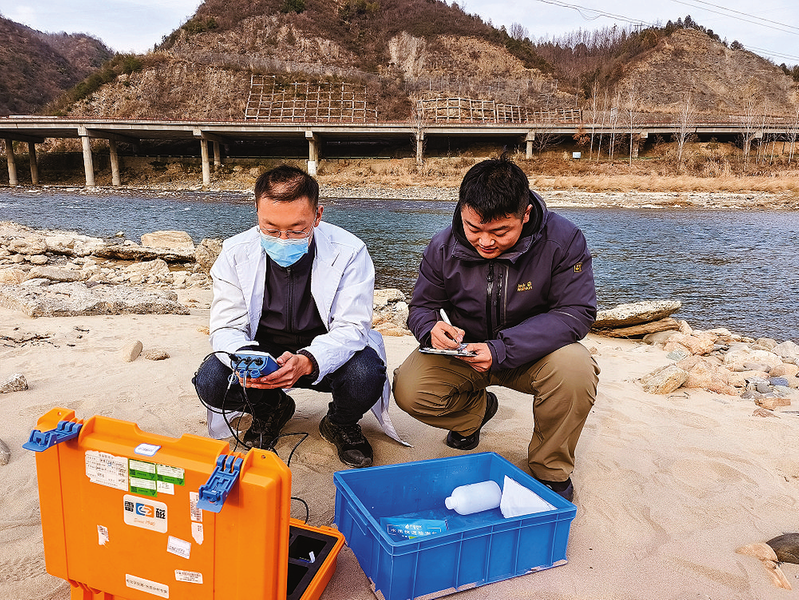 12月8日,在過風樓鎮(zhèn)丹江河畔,市生態(tài)環(huán)境局商南縣分局監(jiān)測站的工作人員在采集水樣,現(xiàn)場初步檢測分析該水域環(huán)境狀況。