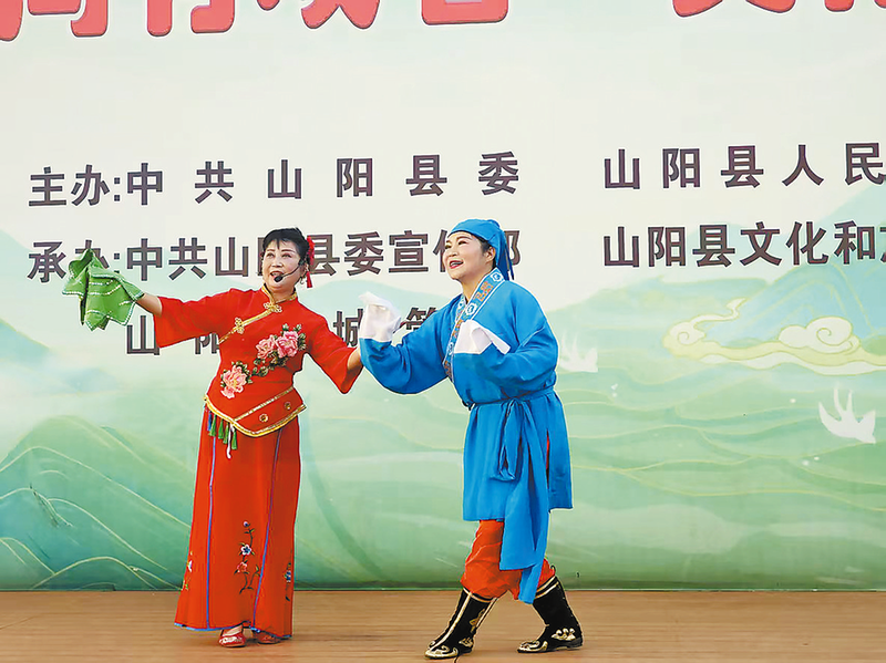 藝術團成員在山陽縣委舉辦的文化活動中表演《夫妻觀燈》。