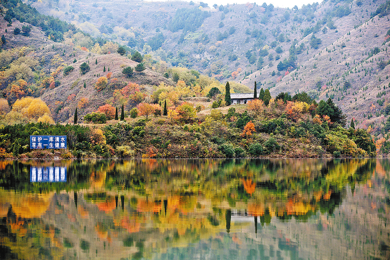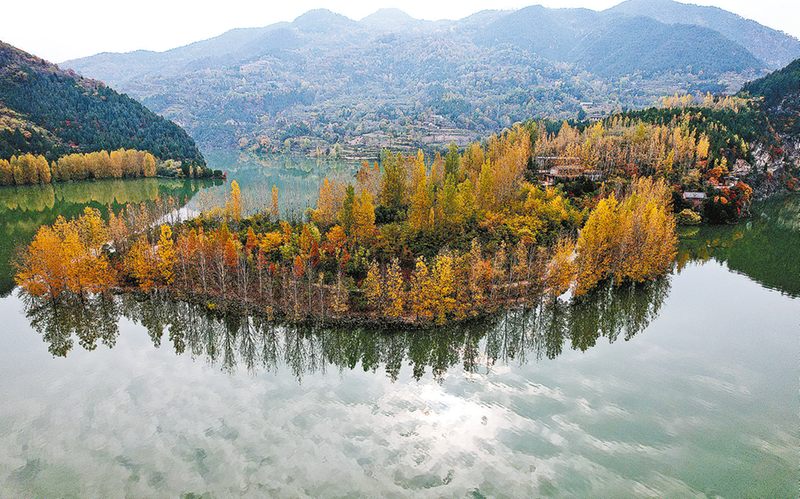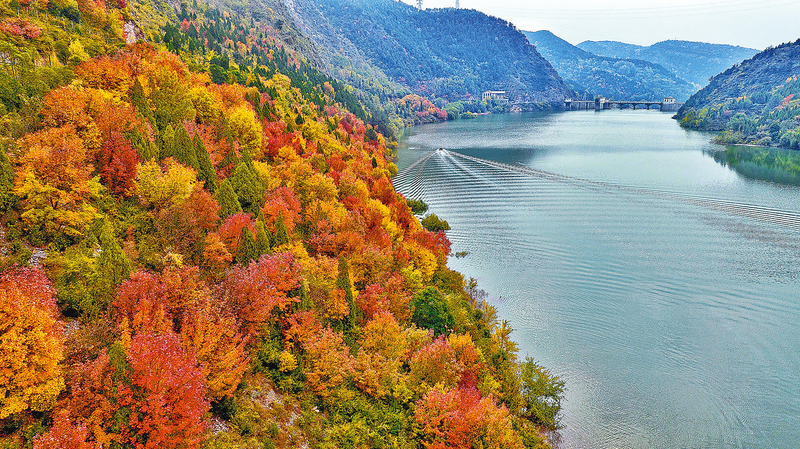 滿山紅葉與遠(yuǎn)處的水庫(kù)大壩相襯映