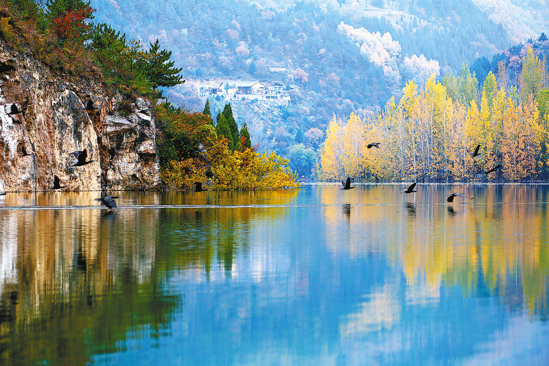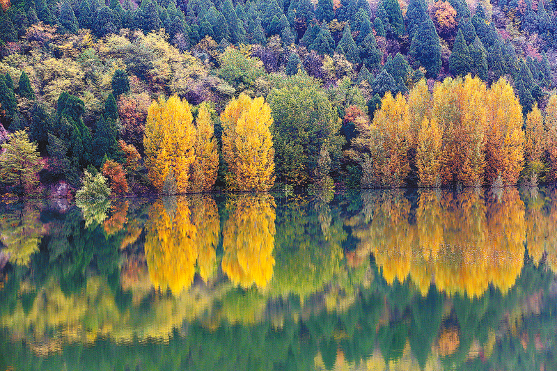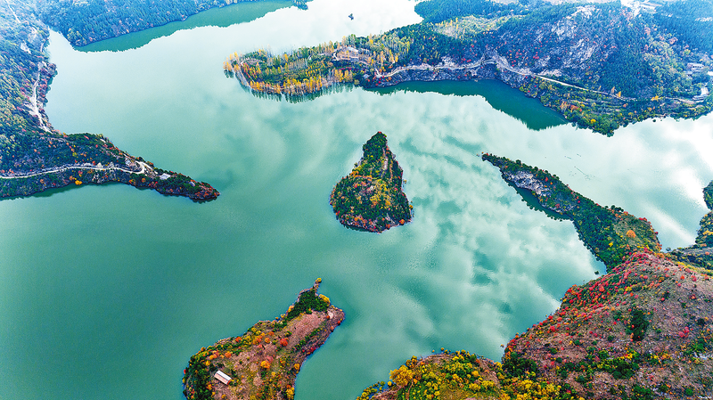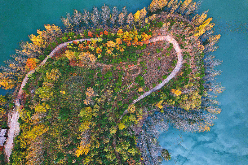 用無人機(jī)沿湖俯瞰,湖畔各種顏色的葉片組成黃的、紅的、橙的、綠的色塊,或是自成一景獨(dú)立于山崖之上,或是相互交融沿山坡一瀉而下;湖面不時(shí)有黑色鸕鶿或白色鷺鳥掠過,為這里的美景帶來了詩(shī)意與靈氣。