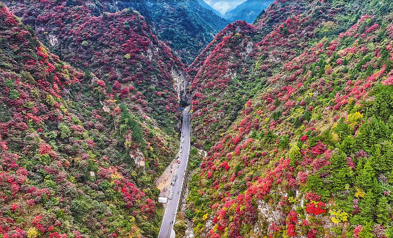 金秋時(shí)節(jié),秦嶺紅葉即將進(jìn)入最佳觀賞期。十月十五日,位于312國道商州區(qū)牧護(hù)關(guān)鎮(zhèn)峽口段的山間正悄然披上斑斕彩衣,紅葉似火的秋日美景吸引了大批游客驅(qū)車前往觀賞。 (本報(bào)記者 楊 鑫 攝)