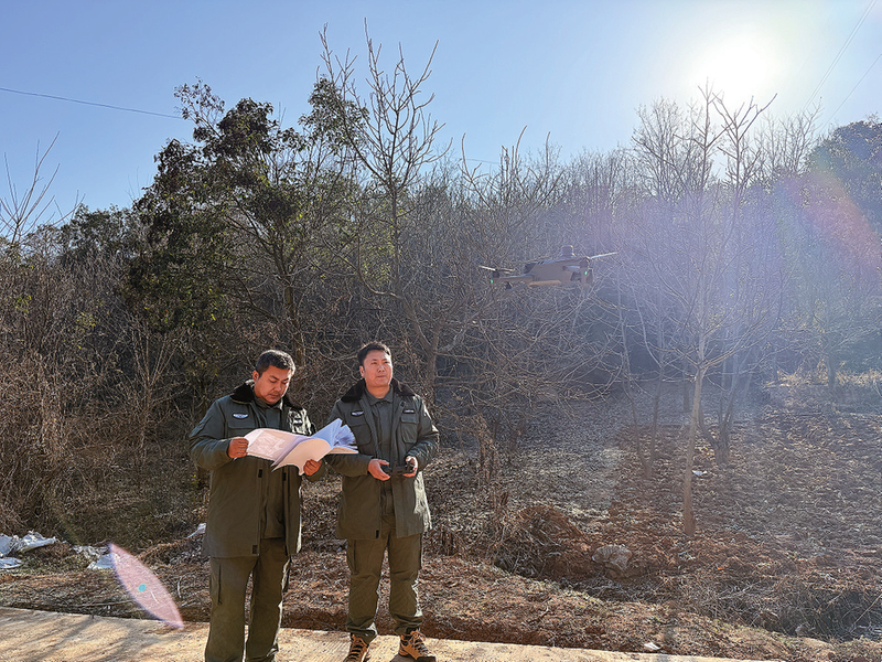 楊超(右)和張毅(左)一人操控無人機、一人配合記錄監測點的信息,共同用科技力量守護青山。