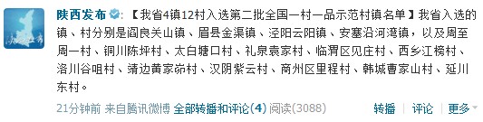 本網訊 我省4鎮12村入選第二批全國一村一品示范村鎮名單,我省入選的鎮、村分別是閻良關山鎮、眉縣金渠鎮、涇陽云陽鎮、安塞沿河灣鎮,以及周至周一村、銅川陳坪村、太白塘口村、禮泉袁家村、臨渭區見莊村、西鄉江榜村、洛川谷咀村、靖邊黃家峁村、漢陰紫云村、商州區里程村、韓城曹家山村、延川東村。(陜西發布)