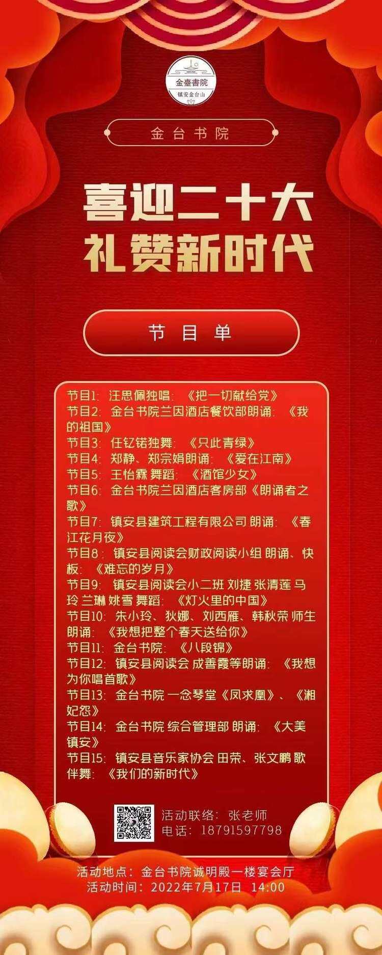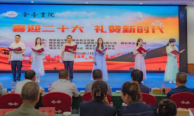 7月17日,由鎮安縣文聯、鎮安縣文化館主辦,鎮安縣閱讀會、鎮安縣建筑工程有限公司、鎮安縣金臺書院承辦,鎮安縣作家協會、鎮安縣書法家協會、鎮安大秦嶺攝影協會、鎮安縣音樂家協會協辦的“喜迎二十大 禮贊新時代”及鎮安縣閱讀會金臺書院分會成立大會線下朗誦文藝交流活動,在鎮安縣金臺書院蘭因酒店誠明殿一樓宴會廳成功舉行。 活動伊始,鎮安縣金臺書院院長翁芳發表了熱情洋溢的講話,指出金臺書院始終堅守“德業并重,以德為本”的核心價值觀,以文化為引領,下設文化酒店、文化平臺、文化教育、文化產品四個中心。金臺書院悅讀會是打造書香書院的重要載體,是實現書院文化平臺功能的重要舉措。鎮安閱讀會金臺書院分會今天正式成立,金臺書院閱讀基地正式授牌,書院將以此為新的起點,充分發揮鎮安閱讀會和金臺書院的“資源、環境、人文”優勢,充分發揮金臺書院作為鎮安一張閃亮的文化名片和文化平臺的功能,不忘初心,砥礪奮進,努力打造鎮安人的精神家園,為全民閱讀建設書香鎮安作出應有的貢獻! 鎮安縣閱讀會會長雷曼曼宣讀鄭靜為鎮安縣閱讀會金臺書院分會會長,翁國淇、郭曉春為副會長,張建為秘書長的任命文件;鎮安縣文聯主席楊逍為鎮安縣閱讀會金臺書院分會、鎮安縣閱讀會金臺書院閱讀基地授牌;鎮安縣閱讀會秘書長朱麗頒發聘書。鄭靜老師回顧了金臺書院悅讀會成立一年來取得的成績,表示未來將一如既往,帶領大家堅持每日誦讀,始終和大家一起,全力以赴,同舟共濟,盡最大努力,共同把金臺書院悅讀會推向新征程! 演出在高亢嘹亮的《把一切獻給黨》獨唱中拉開序幕,金臺書院蘭因酒店餐飲部詩朗誦《我的祖國》道出中華兒女對祖國的深厚情感,舞蹈《只此青綠》傳遞了對中華民族優秀傳統文化的傳承和創新表現。隨著舞蹈、古琴演奏、配樂詩朗誦、八段錦展示等一個個精彩節目的上演,臺下觀眾不時傳來陣陣熱烈掌聲和喝彩聲,合唱《我們的新時代》更是把整場演出推向了高潮。 此次演出的16個文藝節目精彩紛呈,表達了鎮安兒女愛國愛黨愛家情懷,展示了鎮安縣閱讀會各個分會成員、鎮安縣建筑工程公司及金臺書院全體員工昂揚向上的精神風采,為迎接黨的二十大勝利召開營造了濃郁的文化氛圍。