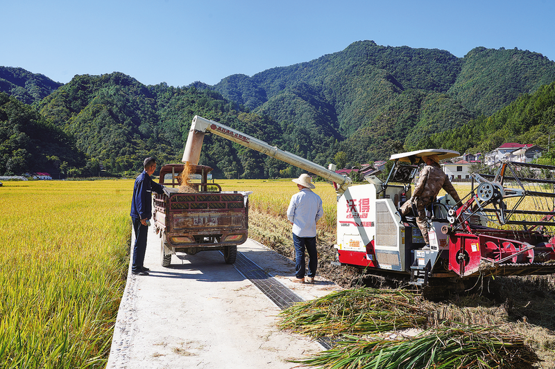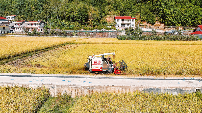 為確保今年水稻的順利收割,當地種植大戶盧錫金還請來了收割機進行搶收。伴隨著收割機的嗡嗡作響,成片的水稻順利歸倉,極大地提高了收割效率。